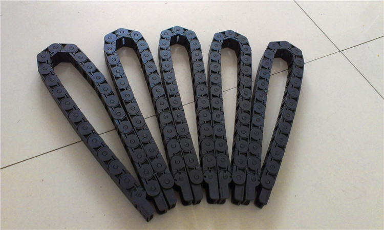 (1)材料:增强尼龙,具有较高的压力和抗拉负荷、良好的韧性、高弹性和耐磨性、阻燃、高低温时性能稳定,可以在室外使用,尼龙含量的多少决定了拖链的使用强度和耐磨性以及运行起来的噪音大小。尼龙含量从5%-17%不等,但超不过19%。一般都是30%左右的含量。